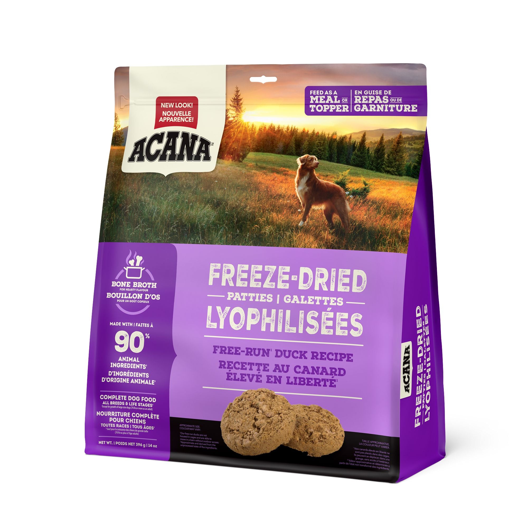La nourriture lyophilisée ACANA procure à votre chien tous les bienfaits des aliments crus, sans les dégâts! Offerte sous une forme lyophilisée pratique en morceaux ou en galettes à émietter, notre recette au canard répond aux besoins naturels de votre chien. Elle est composée à 90 % d’ingrédients d’origine animale de qualité*, dont des organes et des os de canard, de poulet et de dinde, et équilibrée avec des fruits et légumes sains. Elle est également infusée dans du bouillon d’os copieux et délicieux pour un goût que les chiens adorent. Comblez les envies de votre chien avec les ingrédients nutritifs d’origine animale de la nourriture lyophilisée ACANA!