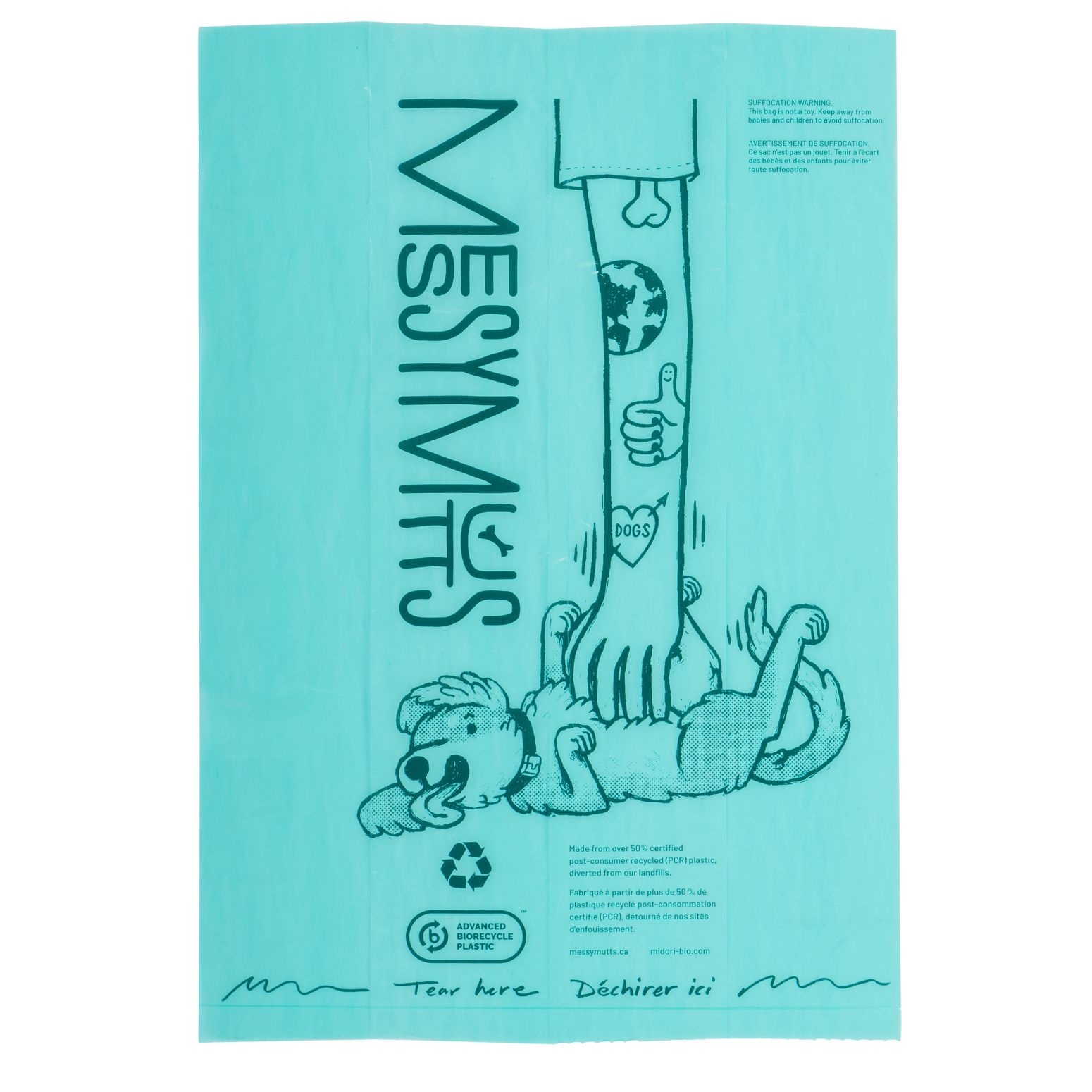 - Les sacs de ramassage biorecyclés de Messy Mutts sont fabriqués à partir de plus de 50% de plastique recyclé post-consommation (PCR) certifié, détourné de nos décharges.