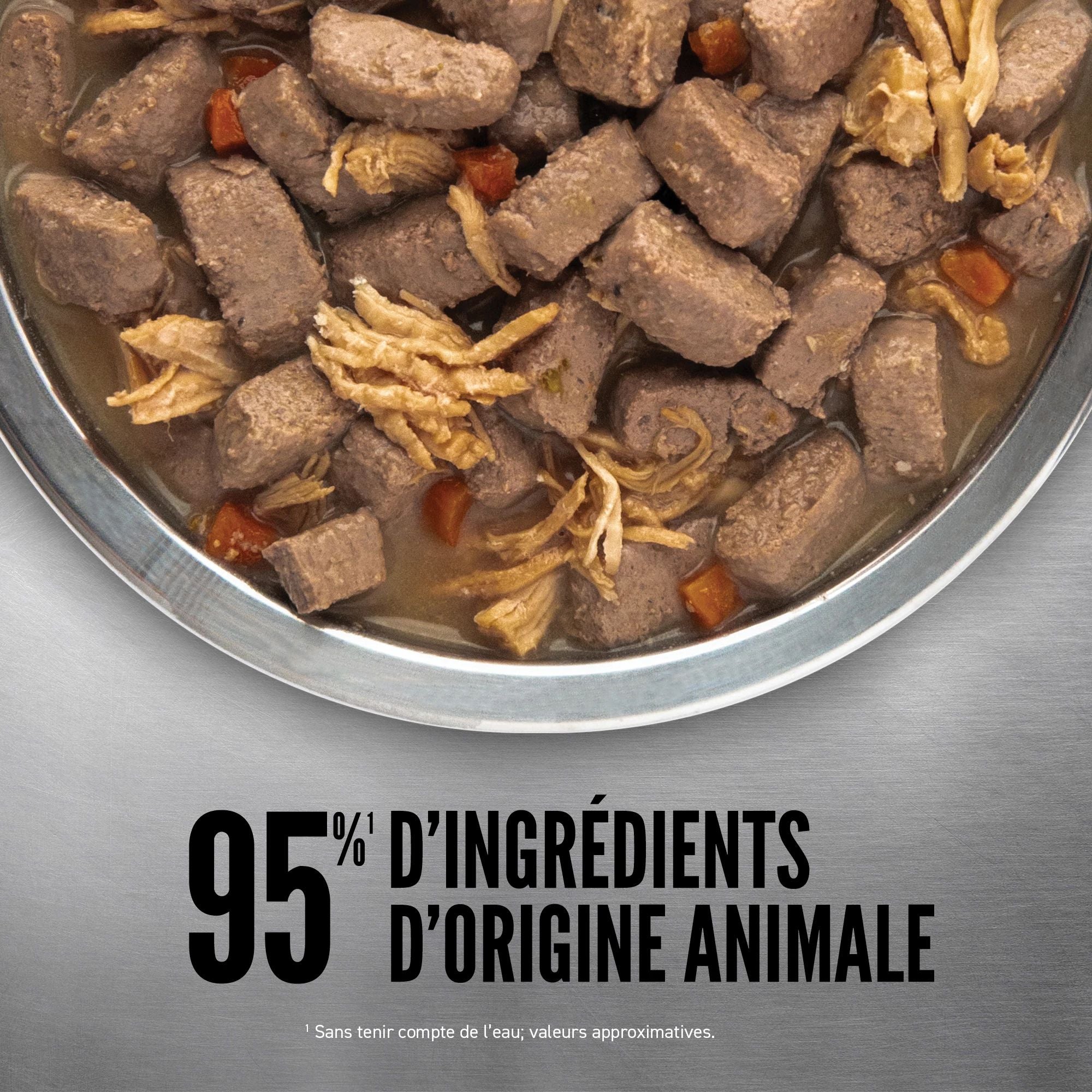 Le Ragoût de recette au poulet ORIJEN regorge de 95%* d’ingrédients d’origine animale de qualité supérieure. Ses cinq premiers ingrédients sont des ingrédients frais ou crus d’origine animale, comme du poulet et du foie de poulet. Ils comprennent également de succulents ingrédients WholePrey comme des organes et des os pour ajouter une source de vitamines, de minéraux et d’acides aminés essentiels. Servez à votre chien les nourritures humides de qualité supérieure ORIJEN seules en guise de repas nutritif, ou donnez-lui en guise de garniture sur ses croquettes ORIJEN préférées pour un petit plaisir nutritif à l’heure du repas.
