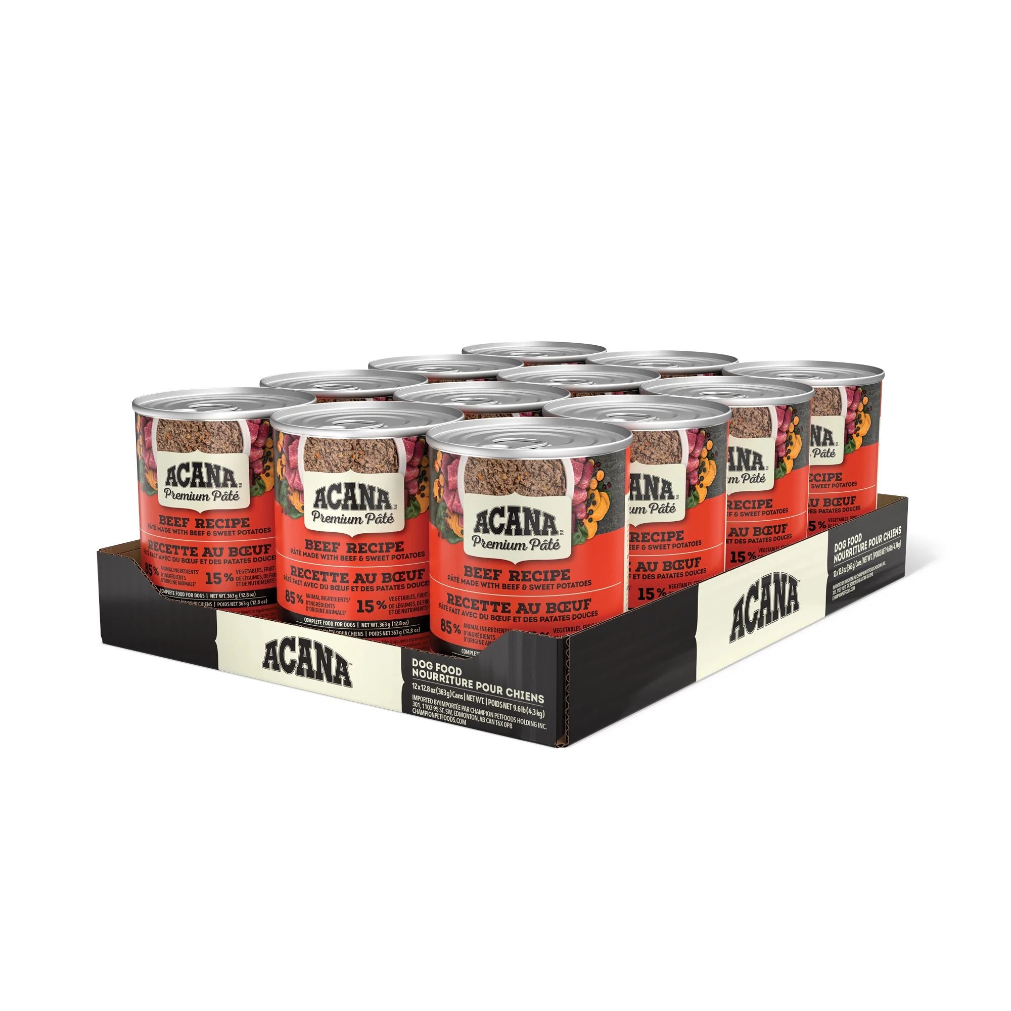 "Comblez l’appétit de votre chien avec la nourriture humide pour chiens ACANA PREMIUM PÂTÉ, qui procure nutriments et hydratation! Cette nourriture humide pour chiens de qualité supérieure procure des bienfaits à chaque bouchée, en contribuant notamment à la santé immunitaire et à la santé de la peau et du pelage. Préparée à partir d’un délicieux bouillon d’os, elle offre également une texture onctueuse et facile à manger pour les chiens. Elle contient 85 % d’ingrédients d’origine animale1 équilibrés avec 15 % de légumes, de fruits et de nutriments1,2. Et puisque nous faisons dans l’excès avec chaque ingrédient qui entre dans la composition des recettes ACANA, cette nourriture humide pour chiens est faite de bœuf riche en protéines équilibré avec des fruits et légumes nutritifs, comme des patates douces et des canneberges. Améliorez l’heure des repas de votre chien en lui servant la nourriture humide ACANA PREMIUM PÂTÉ seule ou en guise de garniture sur sa nourriture sèche préférée. Vous l’aiderez ainsi à se sentir si bien à l’intérieur que cela se verra à l’extérieur!