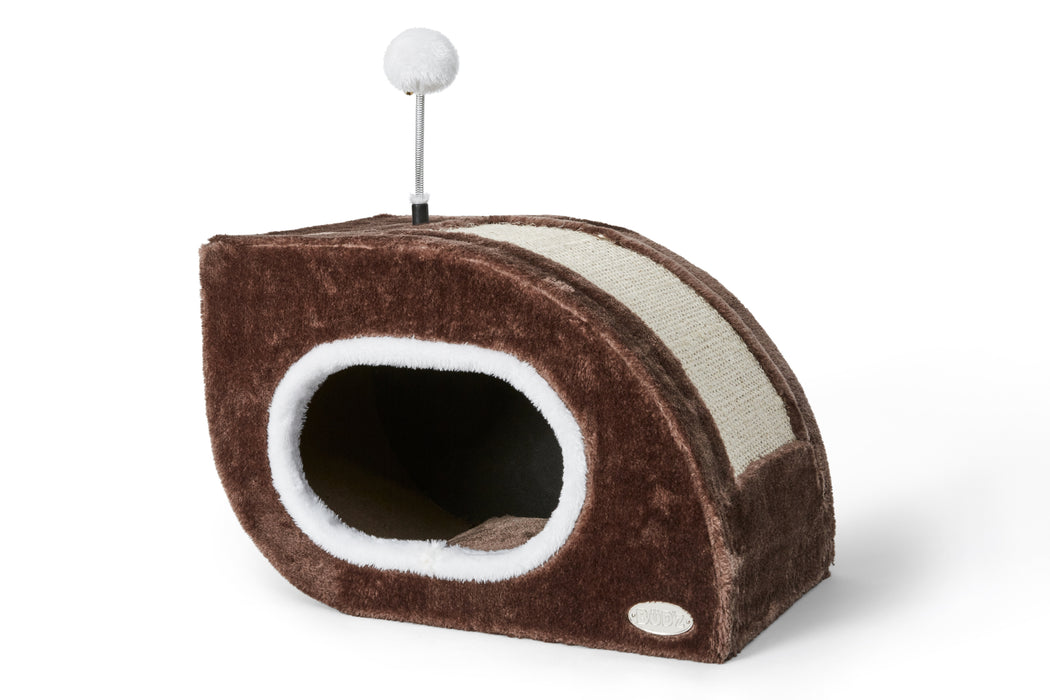 Station de jeu pour chats avec abris en forme d'escargot et boîte à gratter de Bud'z. 45 x 26 x 30 cm. Choix de couleurs.
