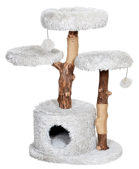 Notre collection d'arbres à chats Savana est unique en son genre! Son bois de poirier naturel récupéré qui provient de l'élagage des arbres et sa fourrure grise pâle seront rehausser votre logis et satisfaire le confort de votre chat. Chaque modèle est unique!