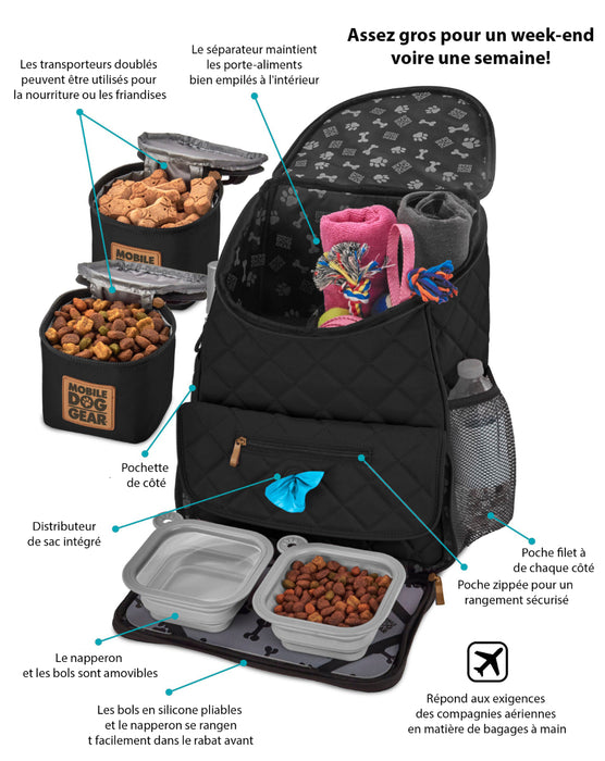 Le sac à dos pour chien Dog Gear Overnight est parfait pour ranger les affaires de votre animal. Le sac à dos comprend deux boîtes de nourriture doublées de 5 tasses contenants, deux boîtes de 2 tasses pliables en silicone bols à chienset un set de table antiadhésif qui se rangent facilement dans le rabat avant.