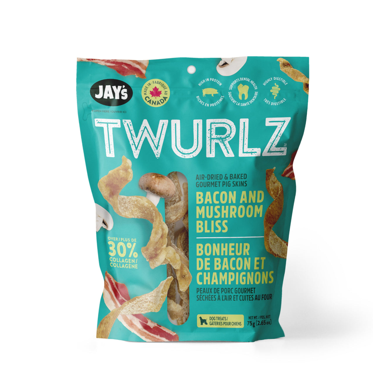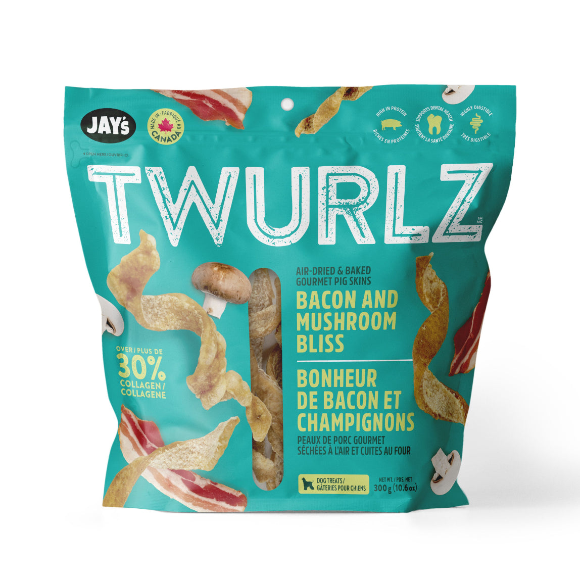 Peaux de porc séchées à l'air pour chiens JAY'S TWURLZ - Bacon & champignons - Choix de formats et de quantités