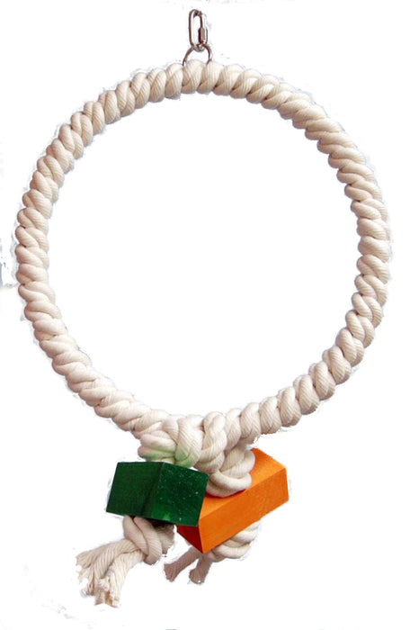 Jouet très résistant en corde 100% coton. Ils aimeront s y percher. Contribuent au confort des pattes de votre oiseau. Diamètre: 14″. Accrocher un jouet a l’anneau du haut.